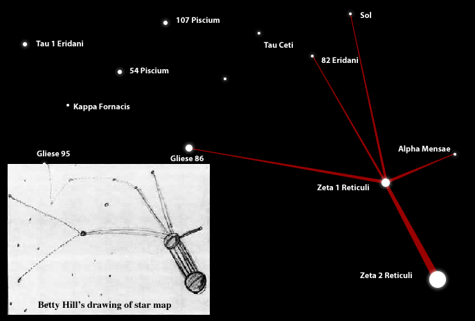 At one point the translator asks Betty, “Do you know where your sun is on this map?” Betty did not and so the translator did not attempt to explain where they were from. However, much later, in a hypnosis session, Betty was told that she would recall the map and that she should allow herself to draw it. Betty did draw the star map [above] which was then examined by astronomers and determined to depict the star system Zeta Reticuli.